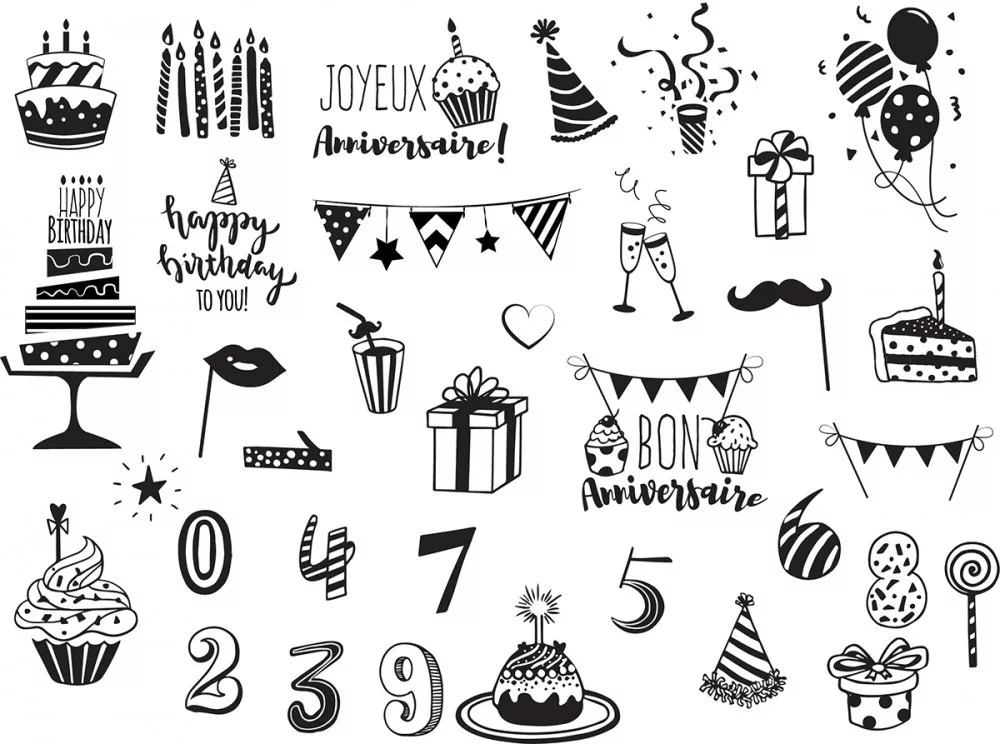 A készlet 35 db bélyegzőt tartmaz, habszivacs alapon szülinap témában.