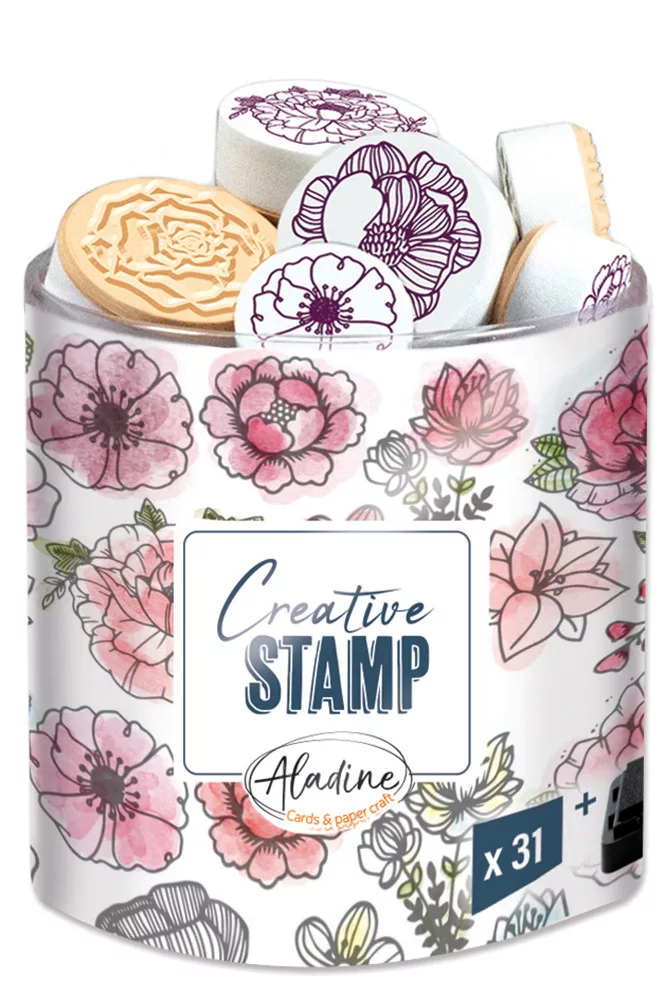 A készlet 31 db bélyegzőt tartmaz, habszivacs alapon virágok témában.
