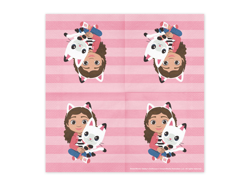 A rózsaszín csíkos háttéren Gabby és Cakey mosolyognak vissza, így az asztalteríték igazi mesés hangulatot kap.