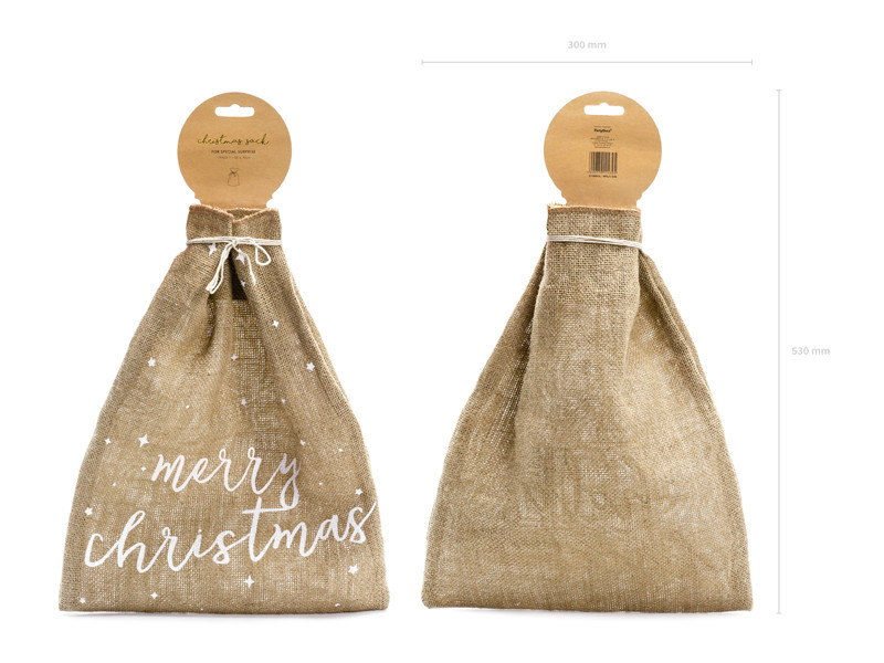 A juta erős anyag, ami környezetbarát és tartós, így ez a zsák nem egyszer használatos csomagolás – évről évre visszatérhet a családi ünnepek részeként. A mellékelt jutazsinór pedig praktikus és dekoratív megoldás a megkötéshez.