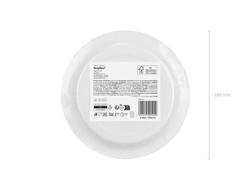 A 18 cm átmérőjű méret ideális süteményekhez, snackekhez vagy kisebb falatokhoz. A tányérok strapabíró papírból készültek, egyszer használatosak, így a buli után nincs mosogatnivaló.