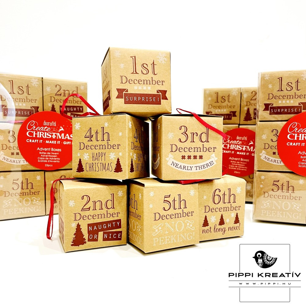 Készíts saját, személyre szabott adventi naptárat ezzel a kraft barna színű, üres adventi kalendárium készlettel! A csomag 25 darab kis adventi dobozt tartalmaz, amelyeket tetszés szerint tölthetsz meg apró ajándékokkal, édességekkel vagy kedves üzenetekkel, így még különlegesebbé teheted az ünnepi várakozást.
